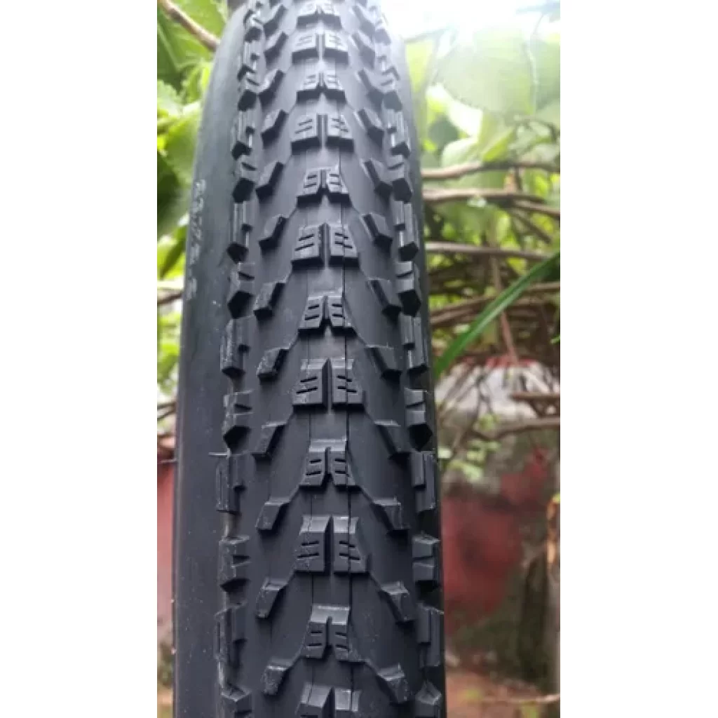 Los tacos de la banda central son bajos para dar menos resistencia al rodar y una buena tracción, y los tacos laterales más pronunciados para un mayor agarre en curva.