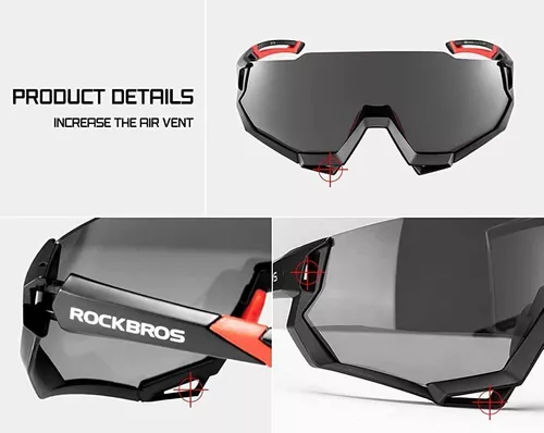 Gafas profesionales deportivas Rockbros de uso deportivo. Unas gafas que se adaptan a la forma de la cabeza y se ajustan perfectamente de manera que no se corren o deslizan. Posee gomas para una perfecta adherencia sobre la nariz. Se adapta rĂ¡pidamente a los cambios de luz con sus lentes especiales para cada actividad. Material de termoplĂ¡stico de alta resistencia con bordes de goma flexible y liviana para evitar el deslizamiento, lente de policarbonato para una excelente calidad Ă³ptica. Resistentes al impacto y muy flexibles para evitar el quiebre.