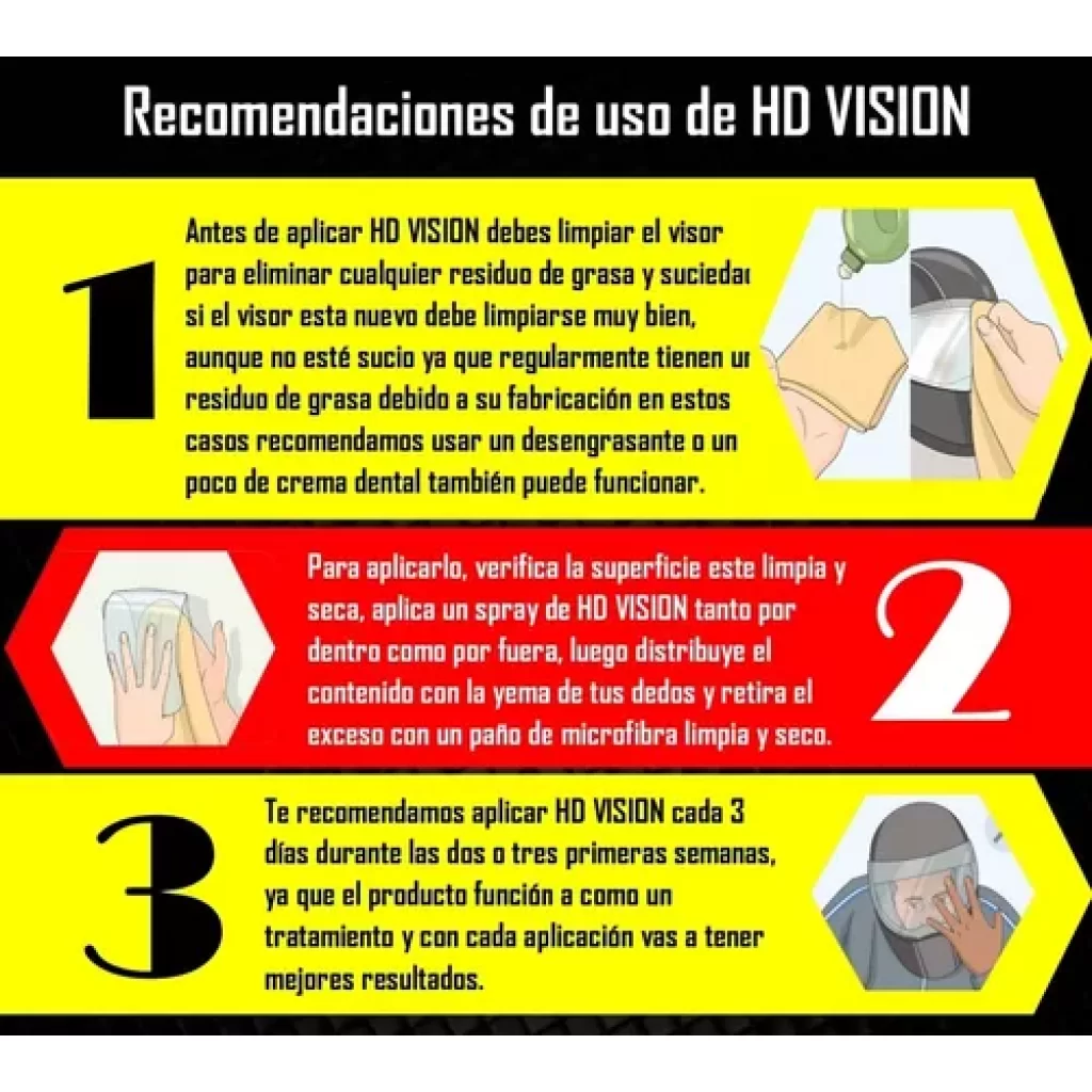 _Antes de aplicar HD VISION debes limpiar el visor para eliminar cualquier residuo de grasa y sucieda si el visor esta nuevo debe limpiarse muy bien, aunque no esté sucio ya que regularmente tienen ur residuo de grasa debido a su fabricación en estos casos recomendamos usar un desengrasante o un poco de crema dental también puede funcionar.